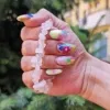 Гривната е изработена от естествени камъни розов кварц с неправилна форма, нанизани на ластична корда.
